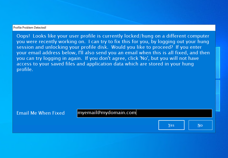 Fix My Session automatically detects FSLogix profile loading failures and VHD/VHDX lock issues in Parallels RAS environments. It notifies users who are logged in with temporary/local profiles, and after optionally obtaining their permission, logs out any stuck sessions (if present) still connected to their FSLogix disks, unlocks any profile disk file handles on shares (including Azure Files) as required, cleans up temporary profiles, and emails users when everything is resolved, prompting to log them back in again.