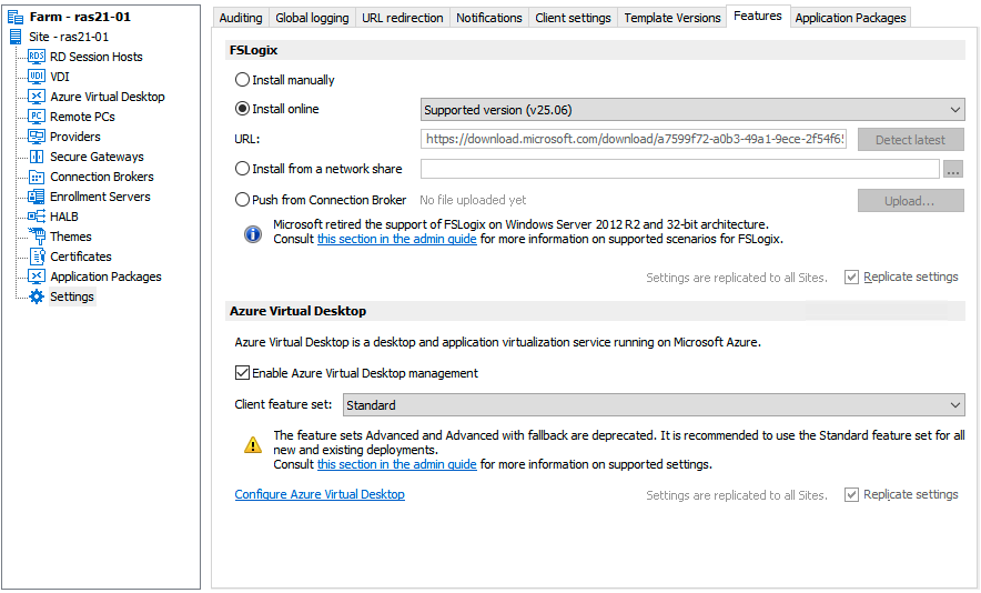 When you manage FSLogix by yourself, you and you alone are responsible for handling updates and upgrades to new FSLogix versions. Contrast this with Parallels RAS, which orchestrates this process for you. Once RAS installs FSLogix on its managed session hosts, you can upgrade to a newer version (or downgrade to an older one) by simply selecting that version from the dropdown menu or by using a custom URL / network share. RAS will automatically handle the upgrade/downgrade, at the site level, host pool level, or even at an individual session host level. There are also options to perform these upgrades via PowerShell for more granular control should you wish.